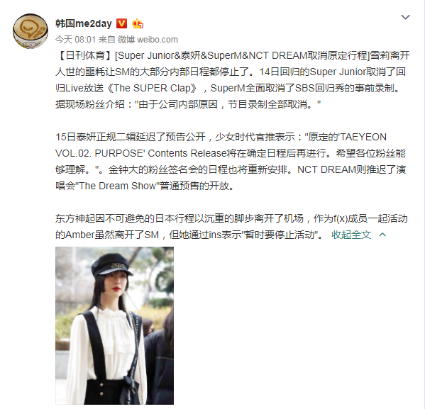 SM公司发表吊唁声明后,也宣布停止公司其他艺人接下来的活动。Super Junior的回归、少女时代金泰妍的新专、EXO金钟大的粉丝签名会…统统延期举行。