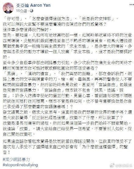 炎亚纶更写下了一段长篇大论称大家应该将重点放在更值得讨论的问题上,尤其应该对“网络暴力”进行检讨。