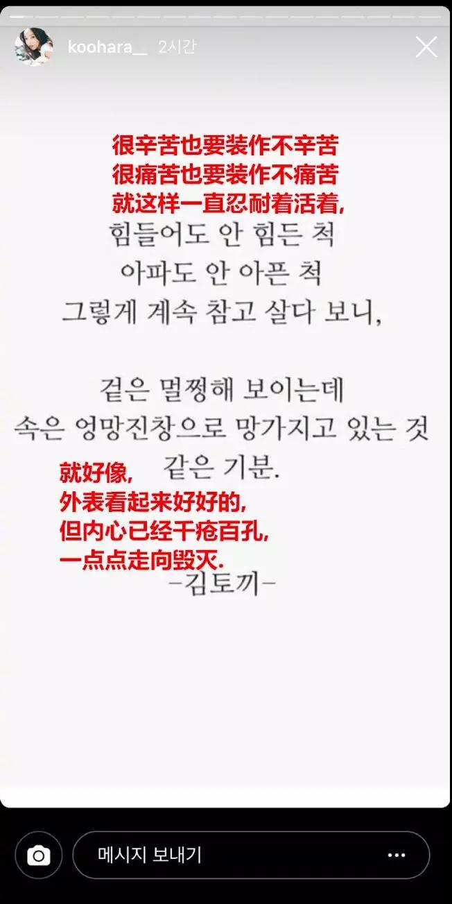后来具荷拉卷入“家暴男友”、“被家暴”、“黄色报复”一系列充满狗血画风事件中,形象继续崩塌,深受负面评论折磨,加上也患有抑郁症,今年5月,具荷拉在ins发了一系列看起来心情状态不太好的话。