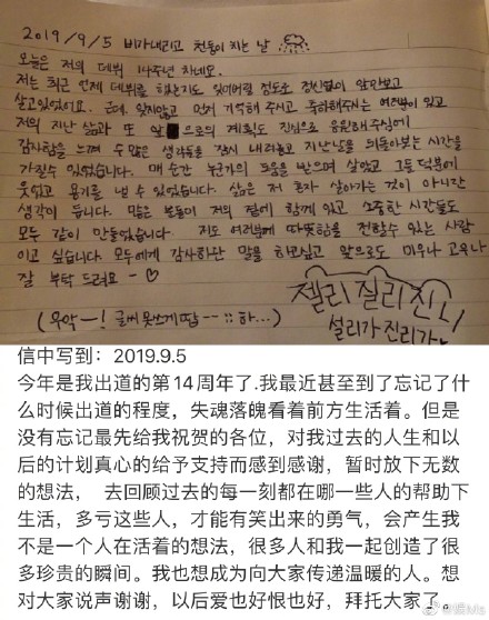 只是在一个月之前,为纪念出道14周年,她上传了一封手写信,感恩身边那些曾经支持过她的人,结尾处“我也想成为向大家传递温暖的人,以后爱也好恨也好,拜托大家了。”语句是带着希望的,她有努力让自己变乐观,只是没想到乐观并不能靠努力得来,这封手写信成了最后的话。