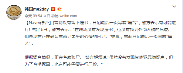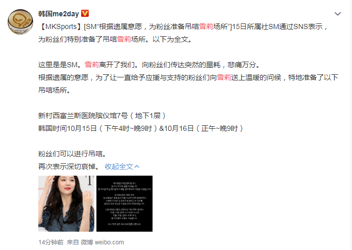 不过为了让一直给予应援与支持的粉丝向雪莉送上温暖问候,SM公司准备了吊唁场所,韩国时间于今天下午4点开始。