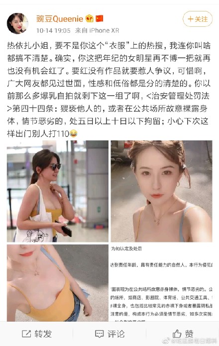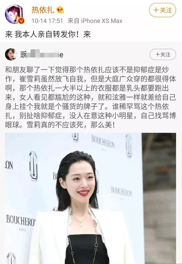 昨天她也发了微博,大概是结合自己然后为雪莉而痛心,本来只是正常感慨,放网友那儿又成了蹭热度。最主要还是热依扎一直因为举止太过自由化受到网友各种攻击,这一来,大家说她吃人血馒头。