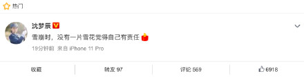 沈梦辰也发表了那句传遍全网的雪花论,“雪崩时,没有一片雪花是无辜的。”,她改成了“没有一片雪花觉得自己有责任。”