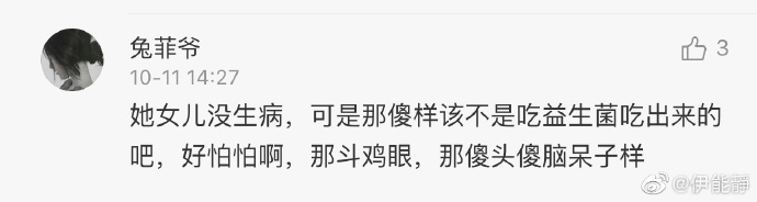 不止这次,其实伊能静一直都在发表这类文字,原因是她每次上传女儿小米粒的照片,都会被一些不怀好意的网友评论小米粒是斗鸡眼,长得丑,可以用来贴门神,看上去智力低下,傻头傻脑等恶言…说的话一句比一句难听。