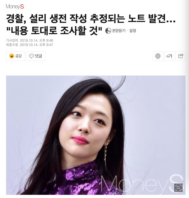 한편 설리의 사망 소식에 소속사인 SM엔터테인먼트는 공식 입장문을 내고 애도를 표했다.