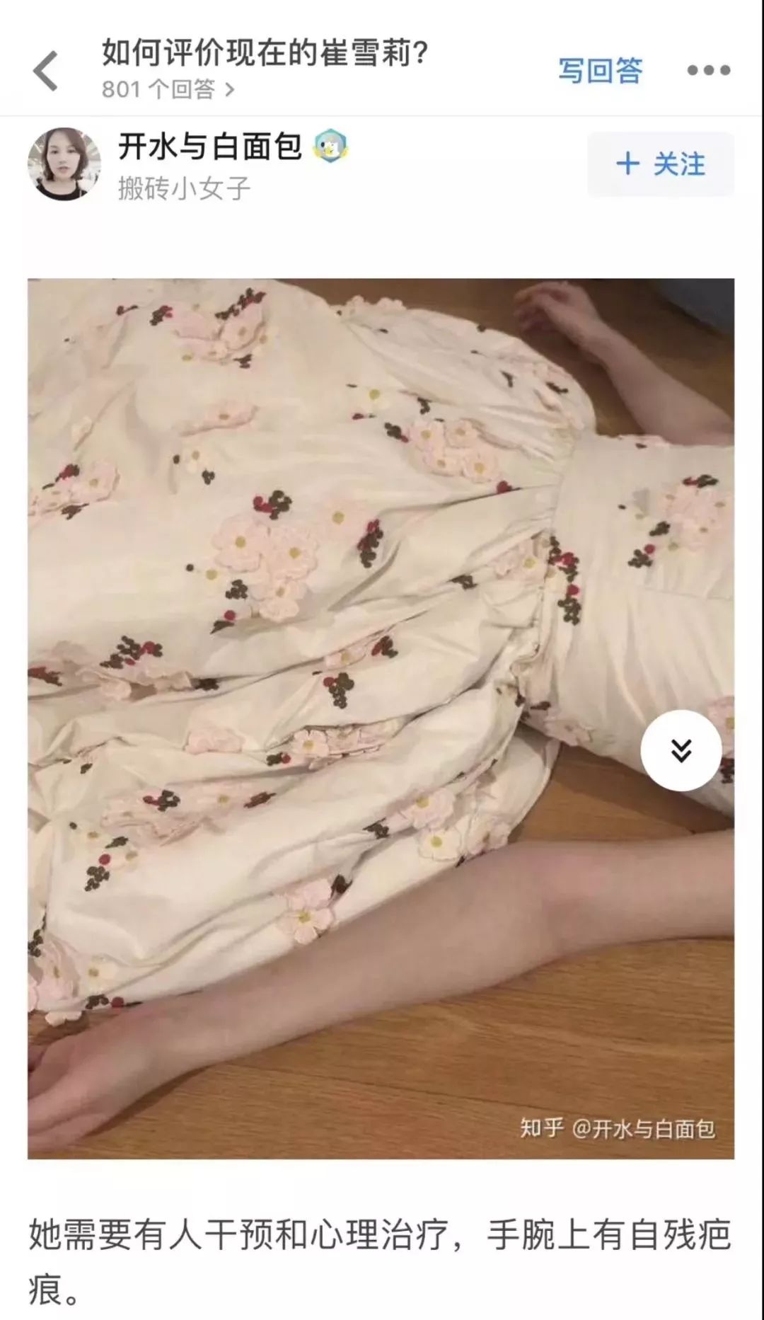 这一行为引起了中国网友的注意,有网友深入研究过她的照片,得出她有在自残的结论,也提出了她需要外人进行心理干预的治疗手段。