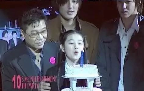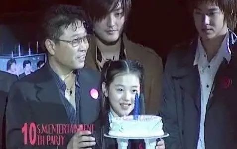 这张照片应该挺多人都看过了,还是个小女孩的崔雪莉站在当年的亚洲一线男团东方神起身边,由SM社长李秀满陪伴,捧着SM公司十周年的纪念蛋糕。