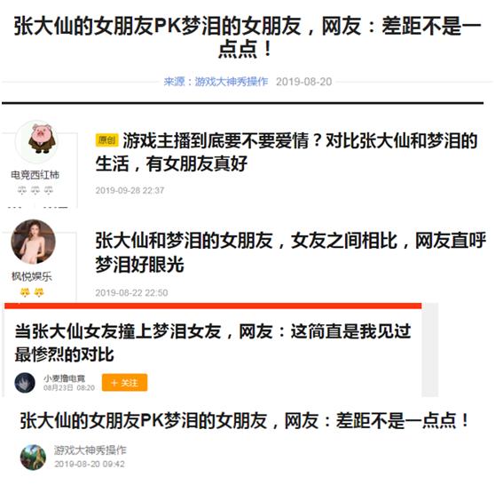 而更奇葩的是,居然还有很多水军拿梦泪和张大仙的女友进行对比!这可以说是很不尊重人的行为,而且这些文章出现时间和内容都大致相同,可以看出背后指使者是出自同一人。