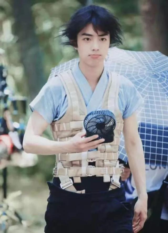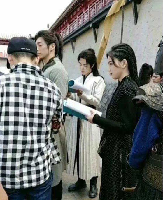 虽然照片的画质不太清晰,但是因为遮挡不了肖战的美颜。例如这张照片中,肖战正认真地看剧本,白色褶皱长袍和额前“虾须”发型,显示出了浓浓的少年侠气。
