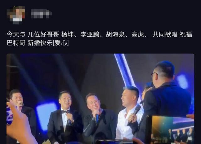 当然,几位圈内好友齐聚一堂,也皆是为了参加众人的共同好友,一位名叫巴特的男子的新婚仪式,视频中,李亚鹏、杨坤、胡海泉、高虎等人合作了一首《路灯下的小姑娘》为新婚仪式带来全场高潮,包括现场气氛看上去也是十分融洽。