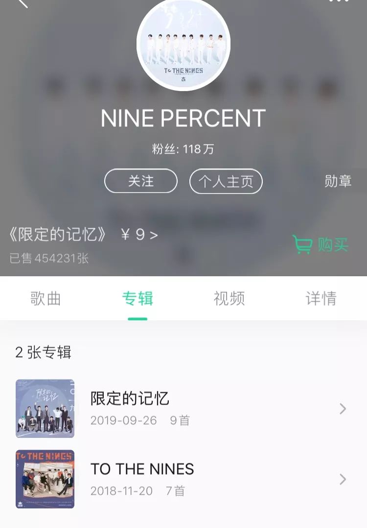 而截至组合解散之前,NINE PERCENT一共发布了两张专辑,第一张《TO THE NINES》发布于2018年11月20日,第二张《限定的记忆》作为组合解散专辑于2019年9月26日发布,第二张专辑中一共有九首歌,分别是每位成员的solo曲,未有合唱曲目。