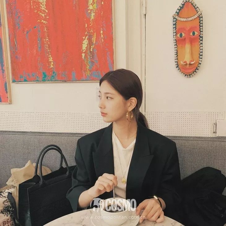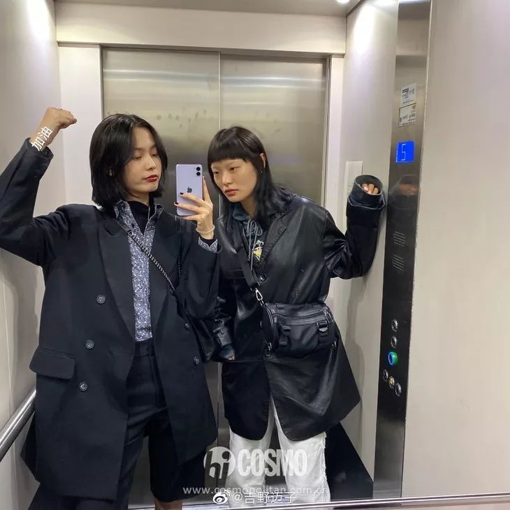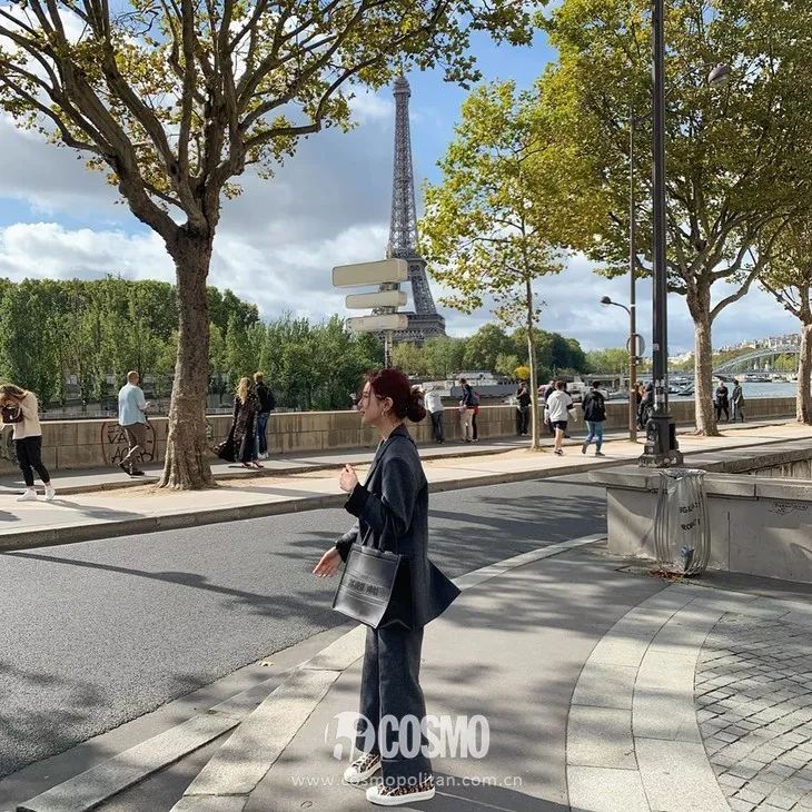 佳丽妹妹和朋友出游也穿起了黑色套装。一边感叹着风很凉,一边在花衬衫里叠穿内搭的佳丽绝对是实穿派代言人了。