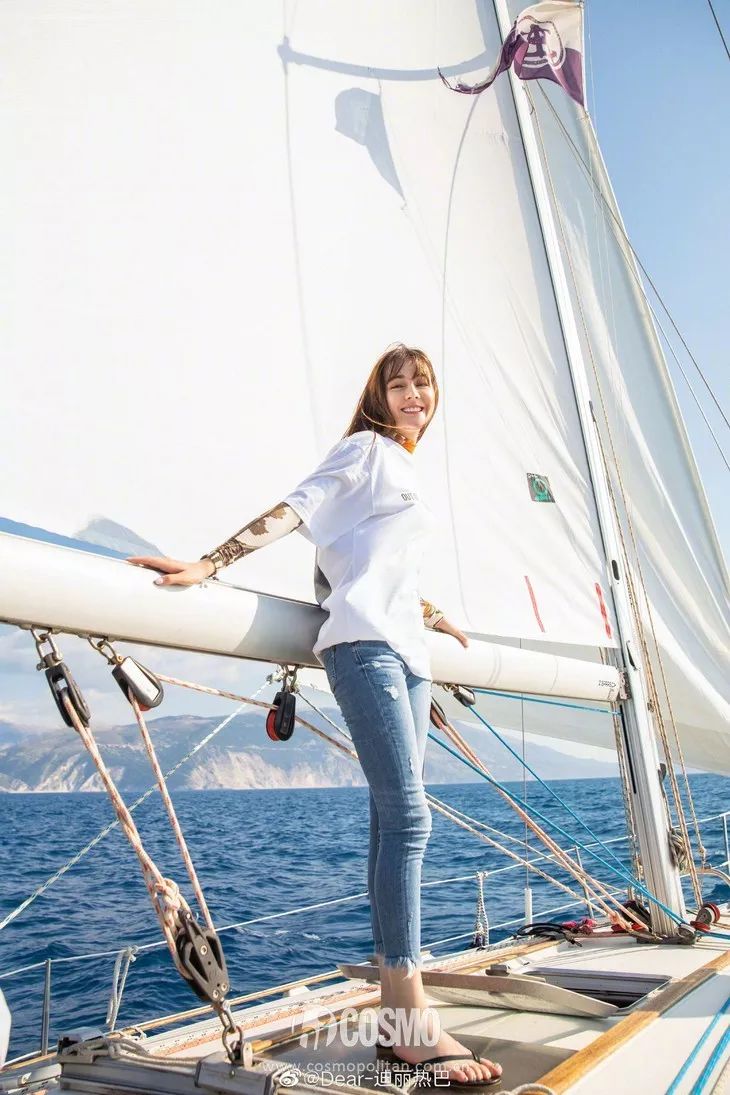白天当然要乘帆出海了,白T、牛仔裤的简单搭配,还原了我们心里那个青春少女。