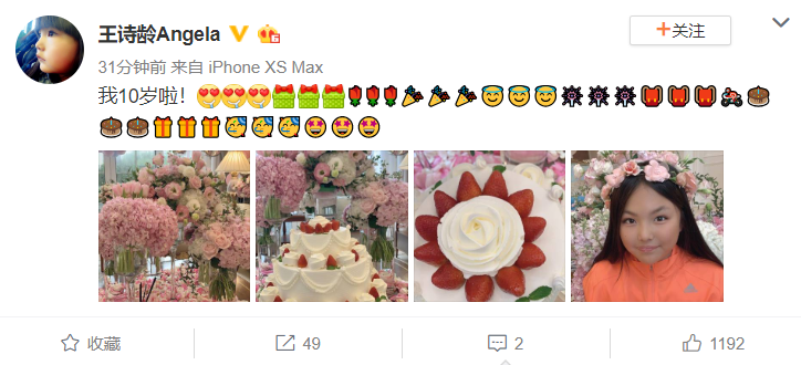 10月13日下午,王诗龄在微博上,晒出数张照片庆祝自己十岁的生日,她发文道:“我十岁啦”,并且还配上许多emoji表情,看上去相当开心。