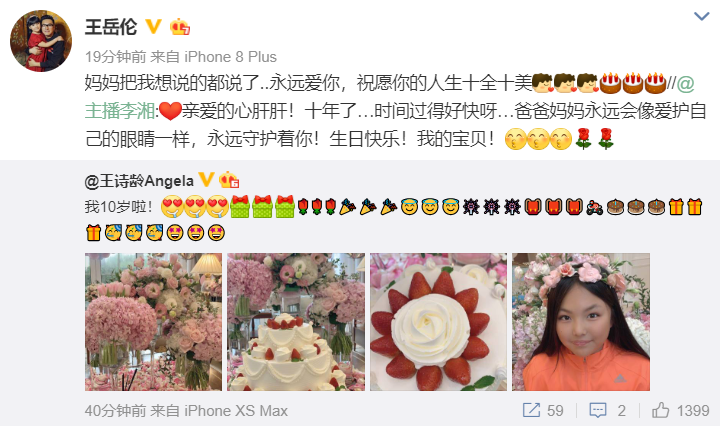 此外,在王诗龄发出微博后不久,李湘也是转发表示:“亲爱的心肝肝!十年了…时间过得好快呀…爸爸妈妈永远会像爱护自己的眼睛一样,永远守护着你!生日快乐!我的宝贝!”而王岳伦则转发李湘微博称:“妈妈把我想说的都说了..永远爱你,祝愿你的人生十全十美”。