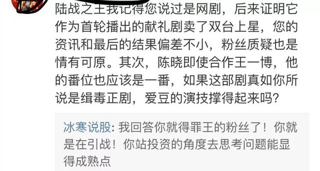 爆料的投资方确实有参与过陈晓上一部播出剧集《陆战之王》,4月的时候就知道了剧集播出时间,同时提及的毛晓彤新电影也爆料准确,《冰雨火》项目信息一发,就有不少粉丝前去询问,投资方与其中几位起了争执,说出不少关键信息。