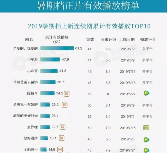 而随之暑假的结束,暑假档电视剧有效播放榜单发布,榜单前十名有些出乎意料,位列榜首的居然不是这个夏天最火的《陈情令》,而是杨紫李现主演的《亲爱的,热爱的》,而鞠婧祎、炎亚纶主演的《请赐我一双翅膀》虽然热度不高,但有效播放量却排在《陈情令》之后,还有因为男女主CP感太差被观众吐槽得很惨的《宸汐缘》也榜上有名,杨洋主演的《全职高手》却意外垫底!