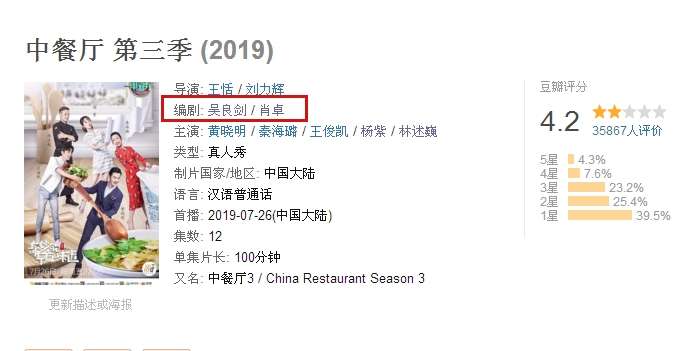 在《中餐厅》收官时刻,节目在豆瓣等处的官方讯息当中,出现了一项明显的变化,那就是标注了两位编剧的姓名。这是前两季的《中餐厅》当中所没有的事情。因为前两季当中,并未提及编剧事宜,所以,大量观众认为,节目当中发生的事情,都是演员们随即完成的,都是自身真实态度的呈现。然而,第三季当中,接近收官,竟然重点标注出了编剧姓名,其意图,也可以仁者见仁了。