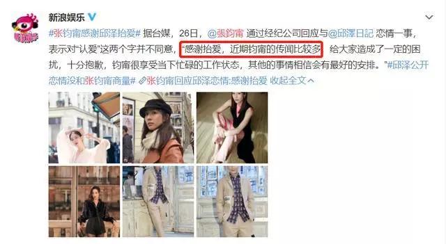 竟然用了“抬爱”两个字,真是太有风度了,张钧甯还是给邱泽留了一点面子,并没有直接说:“对不起,张钧甯没有和邱泽谈恋爱!”而是表示:“其他的事情相信会有最好的安排!”