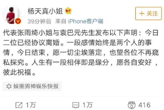 看看杨天真手下的张雨绮,去年的时候确实是爆了一下,而且当时还是杨天真代为发布的离婚消息。