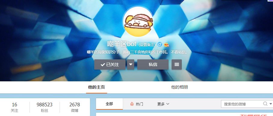 鼎鼎有名的“嘲羊区bot”拥有近99万的粉丝,