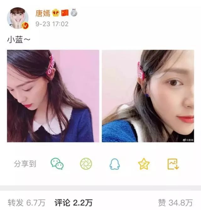 曾经的傻白甜专业户唐嫣也将少女感作为自己的标签之一,她公布怀孕后在微博发了两张自拍,照片中她穿着娃娃领蓝色上衣,夹着粉红发卡,可以说是很可爱了,所以很多人看到这么美的“糖糖”,评论也全在夸她有少女感。