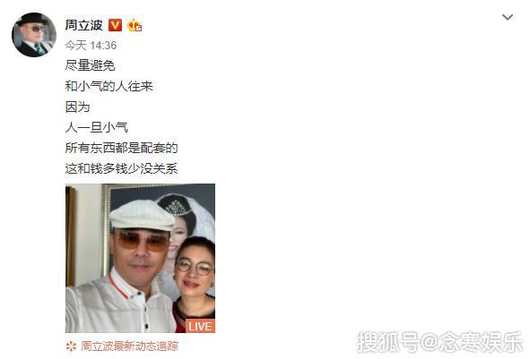 11日下午,消声多日的周立波,再次通过微博分享了“立波式金句”,并配了一张与妻子胡洁同框合影的动态图。周立波呼吁,要尽量避免和小气的人往来,因为人一旦小气了,所有东西都是配套的,这跟钱多少没有关系。从周立波这一番话中,不难看出就是在回应唐爽,毕竟这几天唐爽一直充当着周立波验毒的“新闻发言人”。