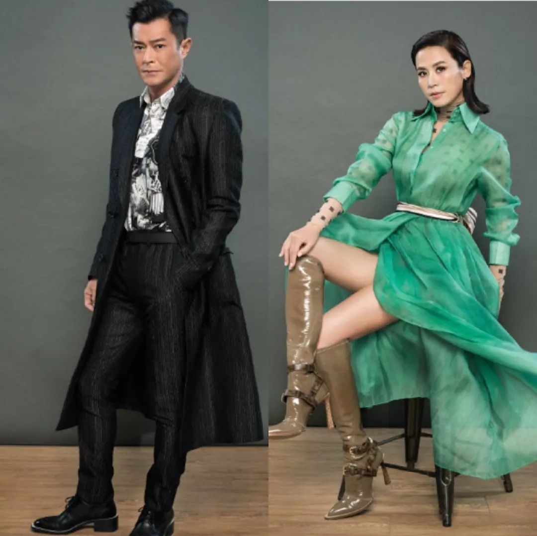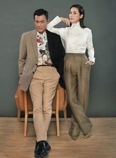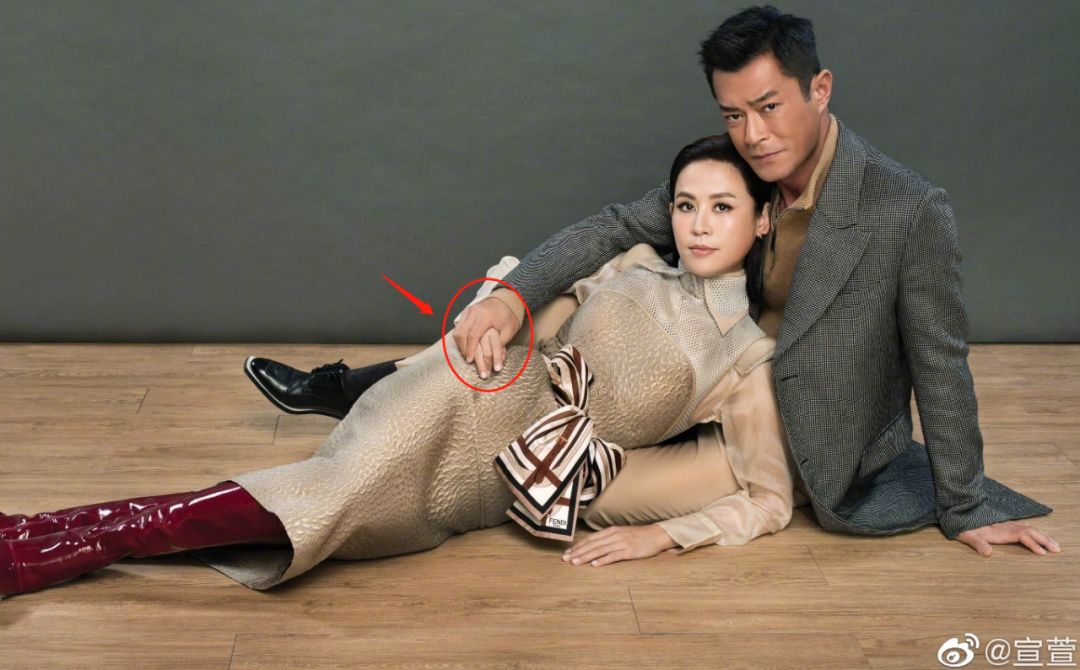 这张宣萱职业装look的打扮,叉腰霸气不失性感。手还环抱古天乐的腿,古仔则把手自然的搭在宣萱的臂膀上,两人都气场十足。