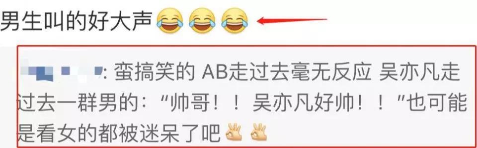 最搞笑的是,在场的男生居多,据当时的网友反映,baby和赵今麦两位仅有的女生走过时毫无反应,吴亦凡走过去时一群男的大喊“帅哥,吴亦凡好帅!”看来吴亦凡减肥后瘦回来的颜值,没有其他人什么事。