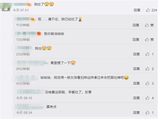 本身不少影视剧里的感情戏是为了引起观众的共鸣,甚至更像是讨好观众,毕竟很多时候太正统的戏可能会让观众觉得疲劳,于是加点感情的戏码也像是为了调节观众的胃口。可惜的只是,这部戏类似这样辣眼的戏码却直接导致观众的胃翻江倒海般的不舒服,不少观众直接看吐:如此,哪儿还有追剧的心情?演员演什么像什么是演技,但是哪个年龄段还是要演适合的角色适合的戏码。