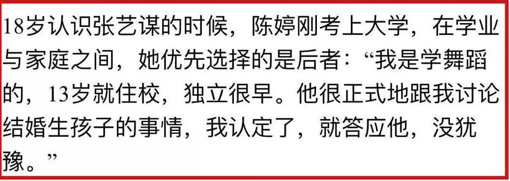 或许是13岁就开始住校,很早独立的缘故,当张艺谋向陈婷提出是否愿意跟他结婚生子时,陈婷毫不犹豫的一口答应了。