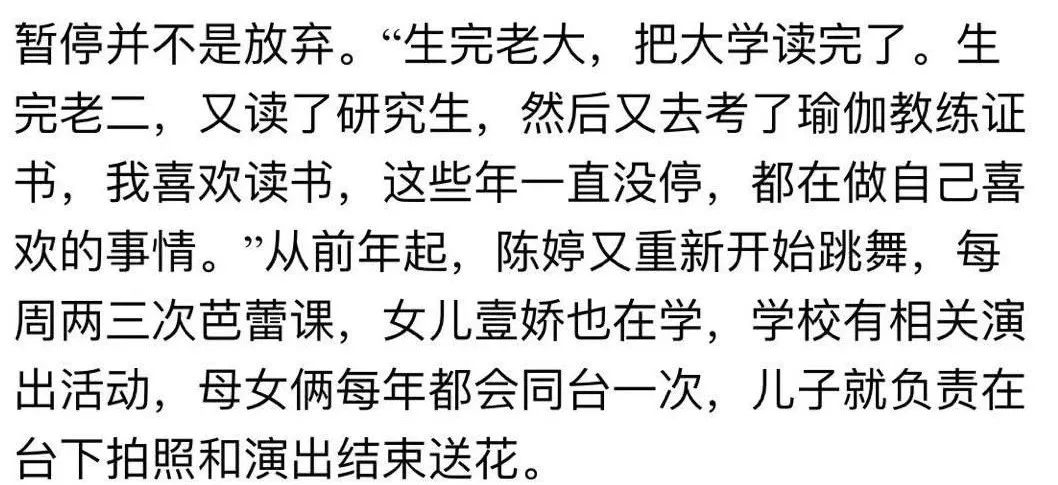 之后的几年时间里,虽然陈婷相继有了二儿子和小女儿,但她仍旧选择攻读研究生,考取瑜伽教练证书,从未停止过做自己喜欢的事情。