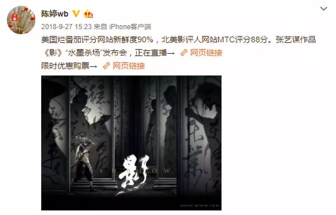 张艺谋的每一次开机、每一次关机、每一次剧宣,她的宣传和祝福肯定不会迟到。