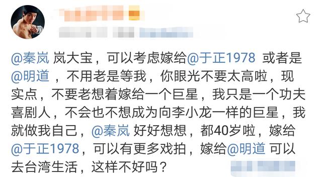 飞龙表示:“秦岚,岚大宝,可以考虑嫁给于正或者是明道 ,不用老是等我,你眼光不要太高啦,现实点,不要老想着嫁给一个巨星,我只是一个功夫喜剧人,不会也不想成为像李小龙一样的巨星,我就做我自己,秦岚,好好想想,都40岁啦,嫁给于正,可以有更多戏拍,嫁给明道可以去台湾生活,这样不好吗? ”