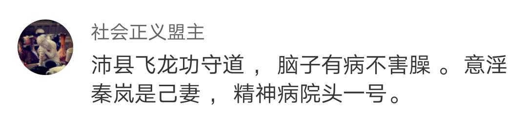 看完飞龙的最新表态后,网友纷纷吐槽道:“沛县飞龙功守道 , 脑子有病不害臊,意淫秦岚是己妻,精神病院头一号。”、“什么时候拍第二部?没钱的话,我们可以发起水滴筹,不过这个要先打断你的腿才行……”、“你是个傻子吗,特别像,真的”、“脑子有病吧,整天蹭热度,厚颜无耻。”、“这个人有毛病,可能是粑粑吃多了”。