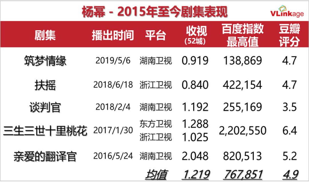 杨幂的流量顶峰出现在2013年和2014年,小时代系列电影的上映和《古剑奇谭》的播出,让她连续两年拿下V榜年度新媒体艺人榜单冠军。尽管杨幂的作品口碑表现整体不佳,但并不影响她的作品在年轻人里的强大影响力,强大的带剧能力,让她尤其受到湖南卫视和视频网站的欢迎。