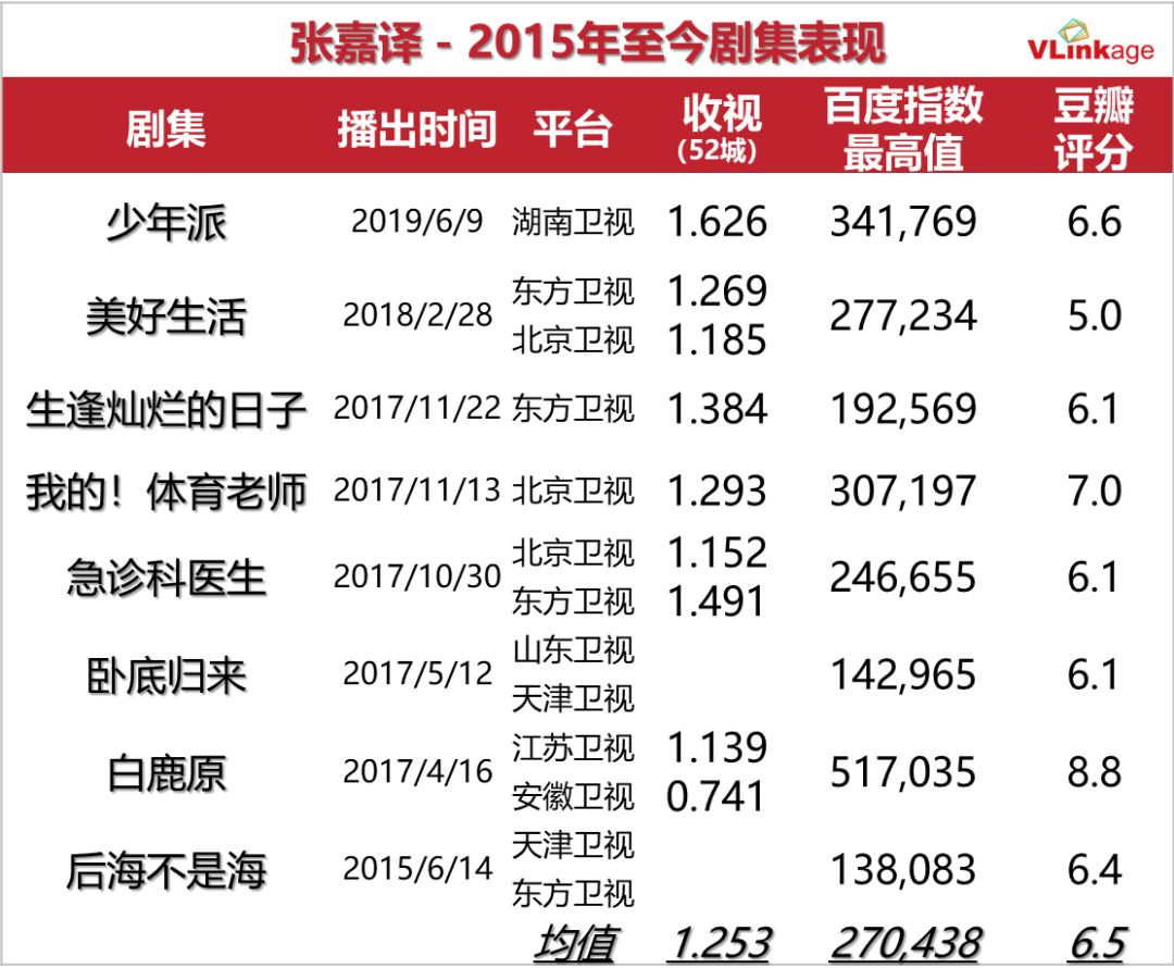 大叔张嘉译是为数不多没有被流量偶像拍出主流市场队伍的中年男演员之一,这得益于他对作品的高标准和对不同类型作品的尝试。从下图可以看见,从2015年到2019年,他的作品涵盖家庭剧、年代剧、言情剧、医疗剧等,这些作品一直有着稳定而庞大的受众,收视率成绩优异。