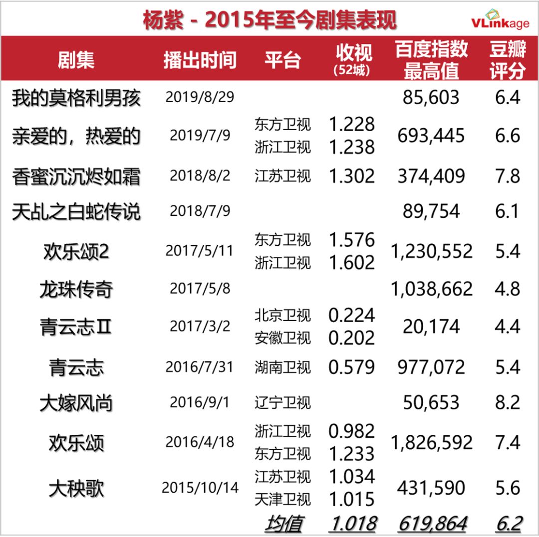 2017年的《欢乐颂2》口碑下滑,但话题度依然居高不下。2018年的《香蜜沉沉烬如霜》成为当年台网表现俱佳的爆款,从这部剧开始,杨紫在主流市场的带剧能力受到认可。2019年的《亲爱的,热爱的》,是今年截至到当前为止最火爆的台网大剧,一举捧红了“现男友”李现,杨紫也被因此被解锁了“旺男主”功能。如今正在拍摄中的《余生,请多多指教》,由杨紫和当下最火的肖战主演,极具爆款潜质。