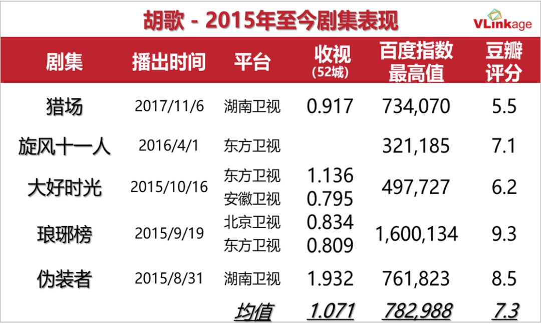 上图为胡歌的作品表现,胡歌成名于2005年的“仙剑”,是当时妥妥的鲜肉型偶像演员,但在最红时遭遇车祸,复出后开始尝试转型。到了2015,胡歌三部作品先后播出,其中正午阳光的《伪装者》和《琅琊榜》开启了他高口碑作品之路,这两部作品不仅让他重回人气巅峰,也成为他转型实力派演员的重要节点。而生活剧《大好时光》则让他在传统受众里有了知名度。