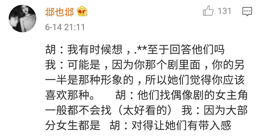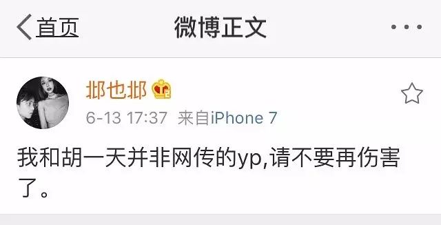 女主邶也邶也很快在微博上自己跳了出来,称自己和胡一天并不是YP。