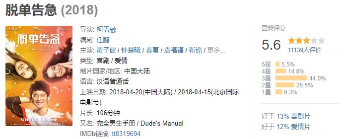 唯有一部主演电影《脱单告急》,豆瓣评分5.6。