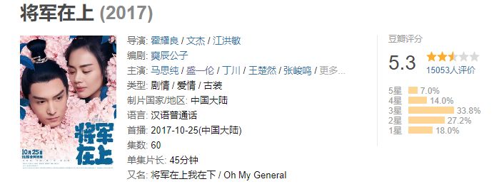 可是搭上名气更大的女主角时,盛一伦仿佛水土不服,比如搭档马思纯的《将军在上》,由太子妃导演执导,按理说可能再创《太子妃》的奇迹,但是讨论度不高,口碑也高速下滑。