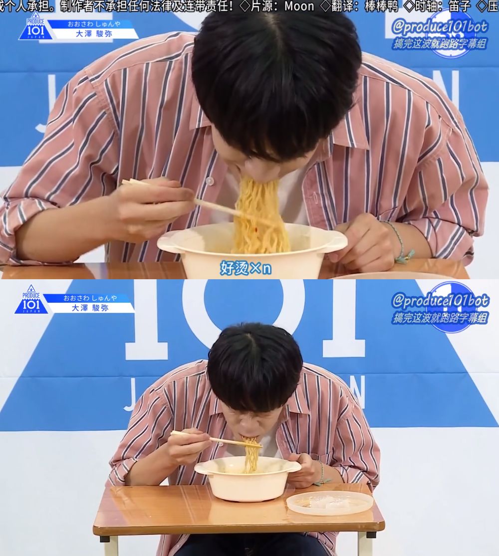 这个弟弟在个人介绍里也很搞笑,一分钟介绍时间内他表演吃滚烫的拉面,把自己烫到跳踢踏舞,话都没讲几句,光给观众看头顶了。