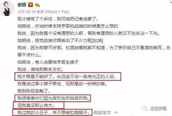 谢楠曾说自己为什么要努力工作,就是为了以后有一天遇到爱的人,能坦荡的说就是因为爱他才和他在一起,不因为他是谁,不因为他有什么,因为我能给我自己所有的东西。