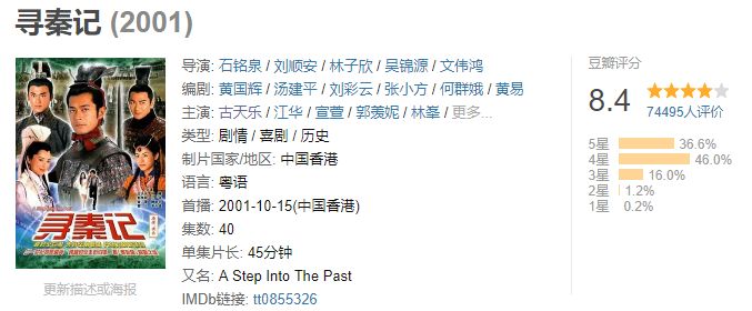 首先是评分,古天乐版本的《寻秦记》评分高达8.4,已经是一个很好看的水平了。
