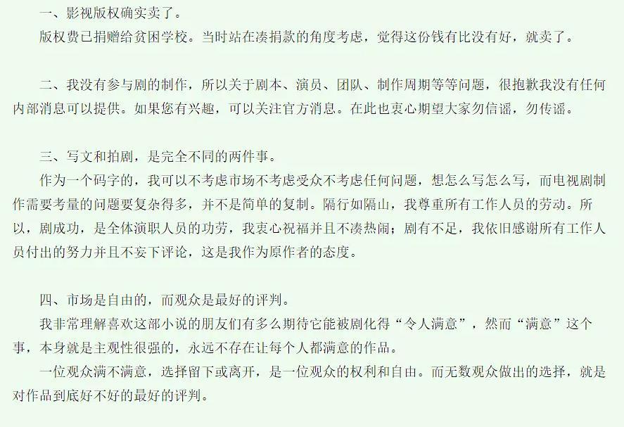 第二点,原作者并未参与《余生》改编工作。每一部剧改作者绕不过去的就是再创作过程中,剧组与原作者的理念冲突。很多影视剧也是因此直接邀请原作者参与剧情,《都挺好》原作者阿耐就是鲜明例子。