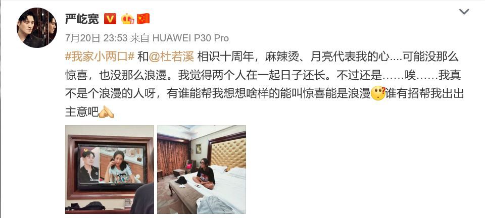 即使已经相恋十年,仍然甜蜜如初,时常能在杜若溪微博下抓到野生宽哥,在线发糖,令人艳羡他们二人稳定长久的感情。