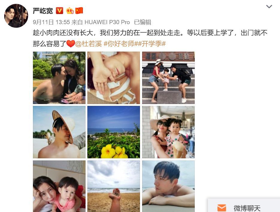 虽然事业上总有坎坷,但严屹宽和他老婆十年的爱情长跑算是在分分合合娱乐圈中的一股清流。观其微博,日常晒老婆晒娃,日常被喂狗粮,一家三口和和美美。