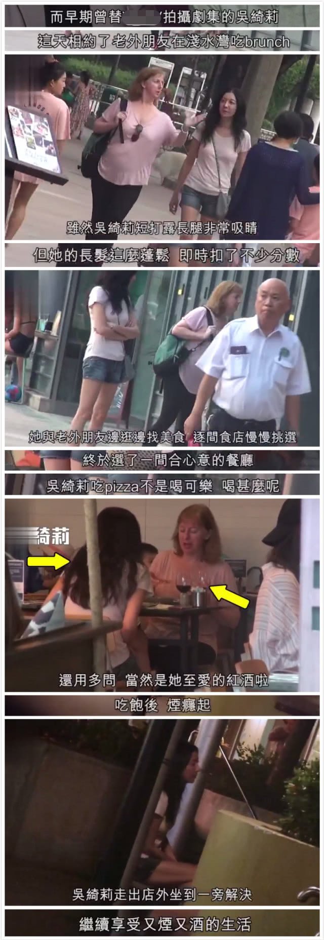 吴绮莉与朋友选了一家餐厅坐下,两人一边喝红酒一边聊天,吴绮莉吃到烟瘾起了,就走到餐厅外面抽烟,又烟又酒,这样的生活就像要麻痹自己一样。