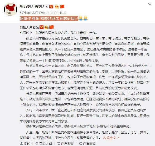 原标题:杨天真宣布与张艺兴解约,不忘夸赞张艺兴:我认为满分优秀的